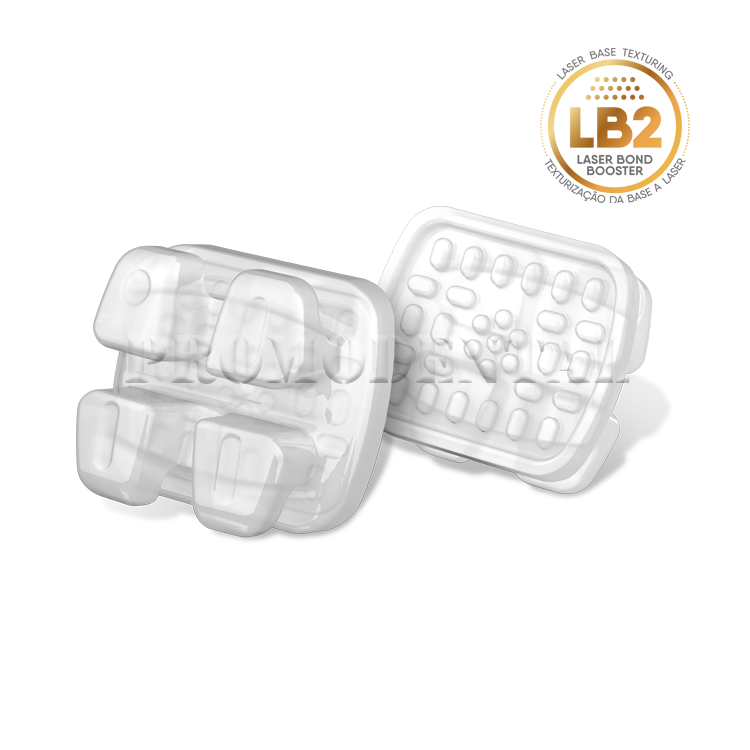 Roth 0.022” ceramic brackets with torque-in-base, low-friction design and color ID for easy positioning. Made of 100% polycrystalline aluminum oxide with patented LB2 laser bonding surface offering up to 30% higher retention. Twin wing design ensures better rotational control and comfort.
