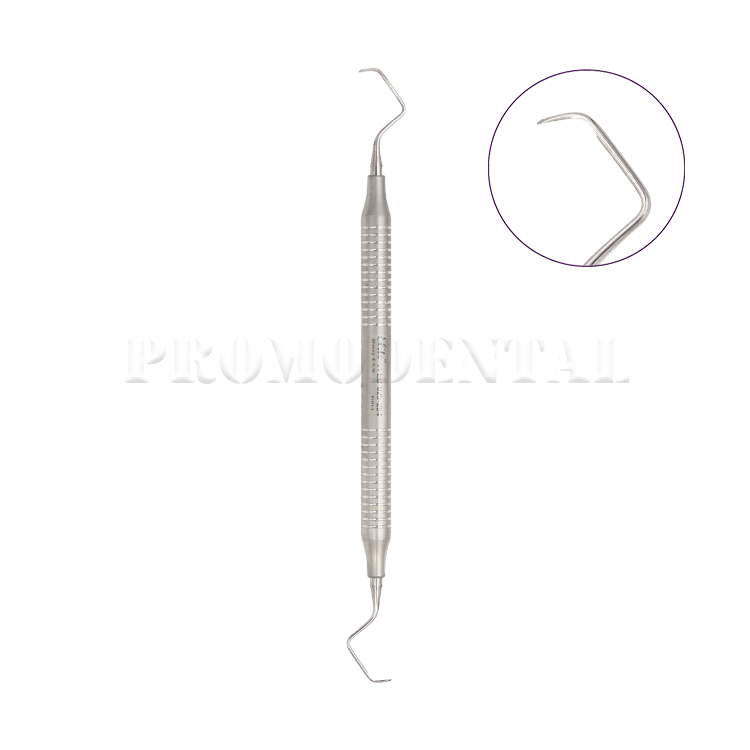 Curette Gracey 9/10 avec longue contre-angulation, conçue pour le détartrage et le surfaçage des molaires ainsi que des surfaces radiculaires difficiles d’accès. Manche creux 8 mm ergonomique et léger pour un meilleur contrôle.