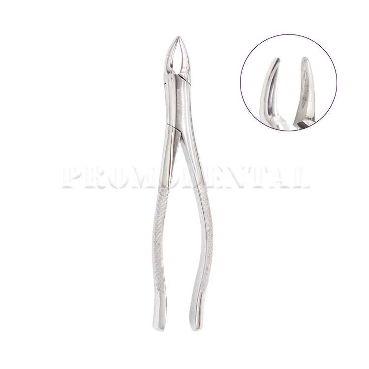 Davier d’extraction modèle américain Fig. 150 conçu pour l’extraction des bicuspides, incisives et racines. Sa longueur de 17 cm assure une excellente prise en main et un contrôle optimal lors des procédures d’extraction.
