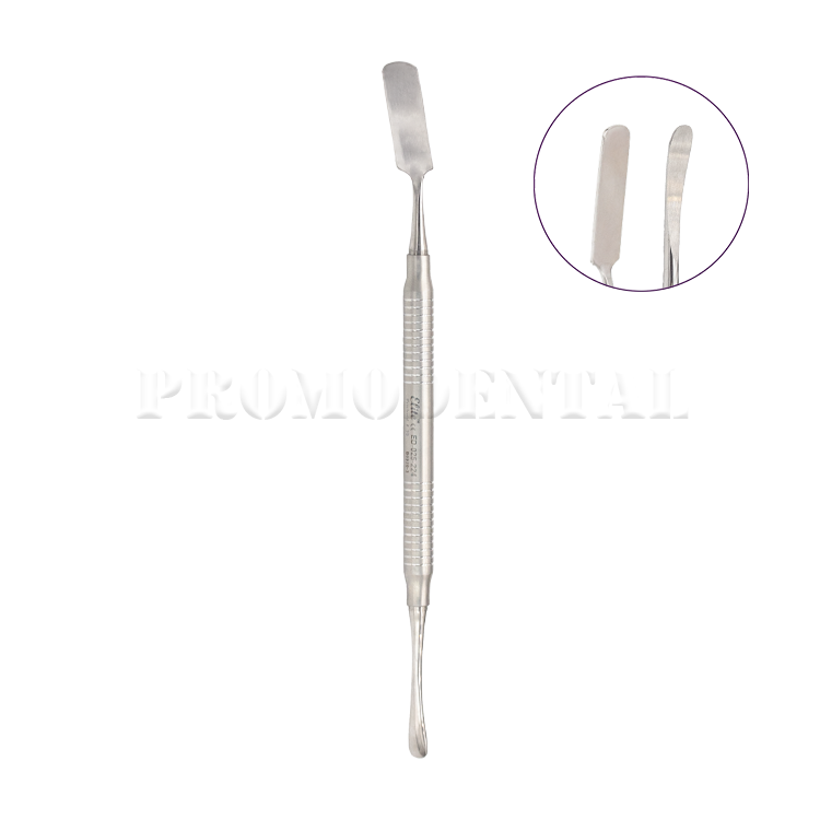 Instrument de parodontie type Prichard (Fig. 1 Buser), conçu pour le décollement atraumatique du périoste. Embouts de 10 mm et 4 mm.