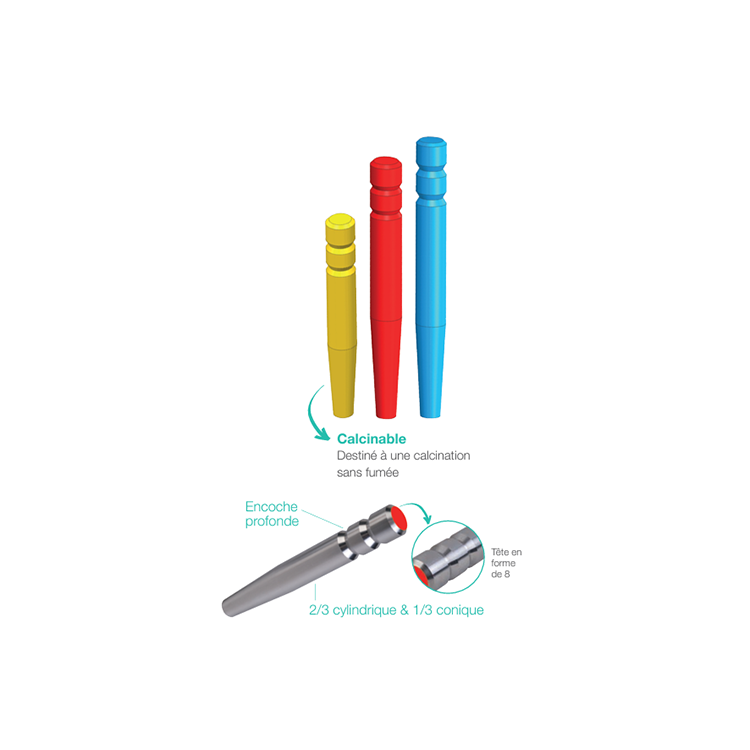 Le tenon calcinable est de diamètre légèrement inférieur au tenon inox afin de pallier les variations volumétriques des matériaux utilisés au laboratoire.