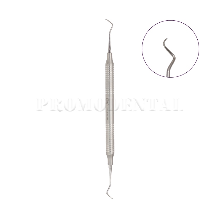 Détartreur double 204S Sickle avec lames en miroir sur tige terminale courte inclinée à 40° par rapport au manche. Longueur active de 4,5 mm et largeur de lame de 0,9 mm. Manche creux 8 mm.