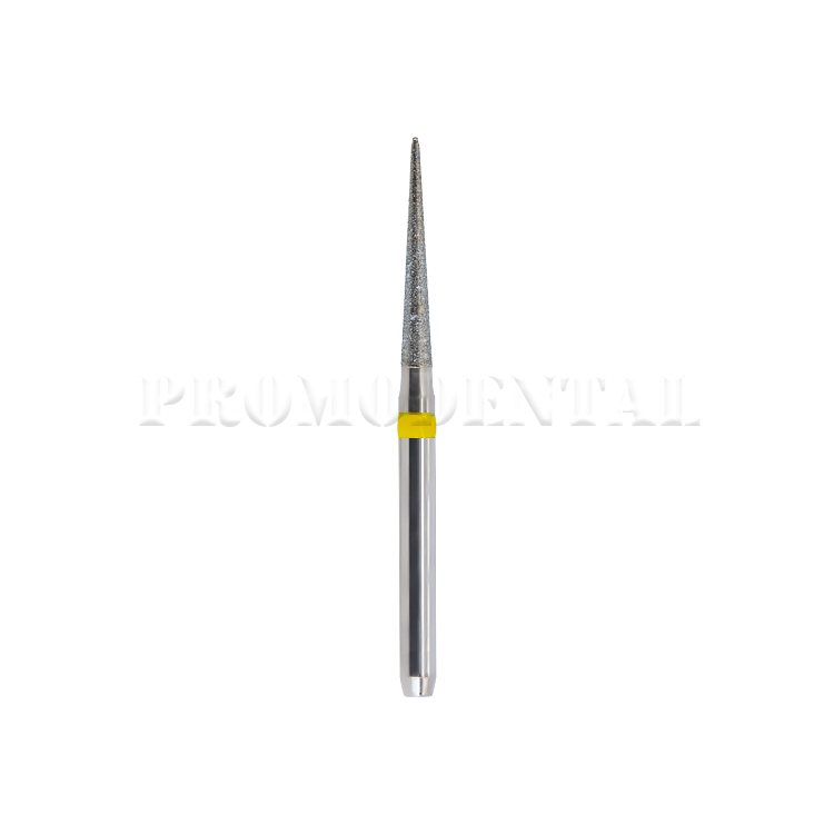 A dental diamond bur with a conical torpedo shape designed for controlled and accurate tooth preparation and shaping. Its conical form tapers to a fine point, making it ideal for creating precise contours and smooth surfaces in various dental procedures. The diamond-coated surface ensures efficient cutting, while its versatility and precision make it an essential tool for dental professionals in tasks such as cavity preparation, restoration shaping, and tooth contour adjustments, all while minimizing damage to surrounding healthy tissue.