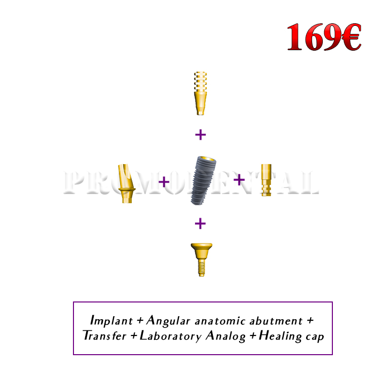 Implant + angular anatomic abutment + transfer + analog + healing cap