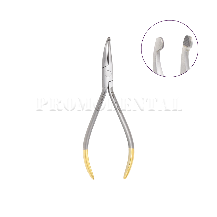 Pince orthodontique à mors striés inclinés à 45°, avec inserts en carbure de tungstène pour une prise précise et durable.