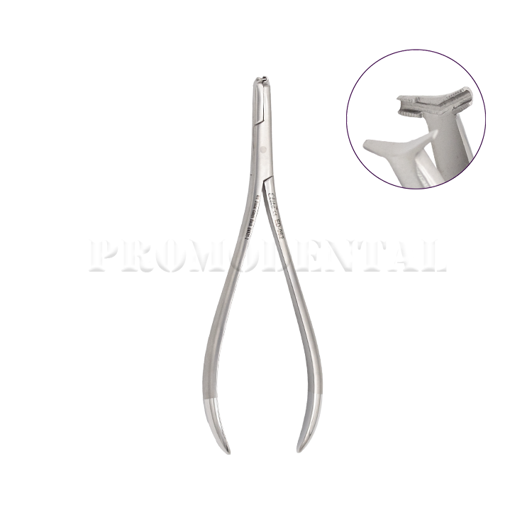 Pince tête de marteau spécialement conçue pour le pliage et la sécurisation des extrémités distales des arcs orthodontiques en NiTi. Modèle Non-TC (sans inserts en carbure de tungstène), assurant précision et contrôle lors des ajustements.