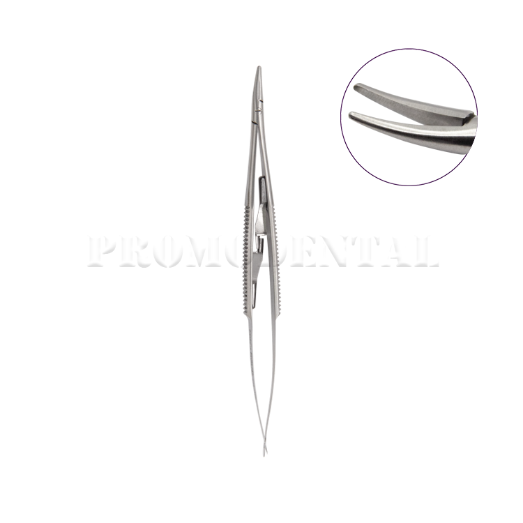 Porte-aiguille Castroviejo courbé de 14 cm, conçu pour des sutures fines et précises, offrant un excellent contrôle et une grande maniabilité.