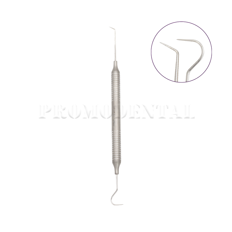Sonde exploratrice dentaire double extrémité Fig. 16/23 avec manche creux de 8 mm, idéale pour la détection des caries et l’exploration précise des surfaces dentaires.